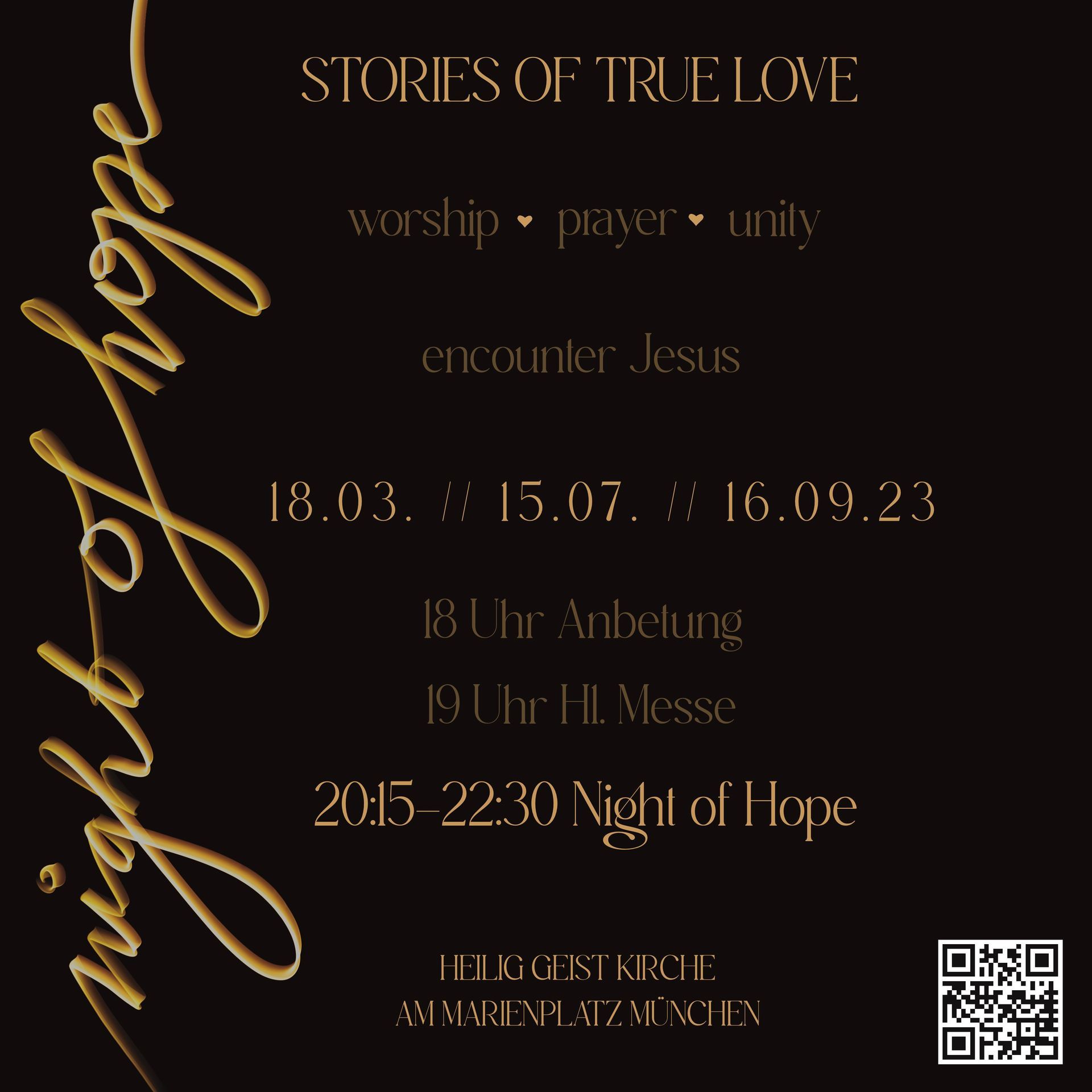 Im Herzen von München, zwischen Marienplatz und Viktualienmarkt, öffnet die Heilig Geist Kirche ihr Hauptportal.Tritt herein in den schönen Ort, in Gottes Gegenwart und erlebe seine Nähe in einer Atmosphäre von Gebet, Lobpreis, bei Zeugnissen und vielem mehr.